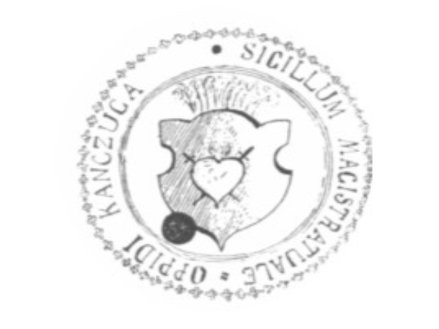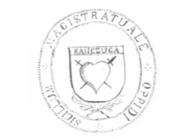 Miasto w pierwszych zapisach źródłowych figuruje jako miasto prywatne. Miasta tego typu nie posiadały swoich herbów tylko używały pieczęci miejskiej godła herbowego swojego dziedzica. Właściciele miasta zmieniali się, dlatego trudno ustalić pochodzenie herbu. Jednakże najwłaściwszym dla Kańczugi był herb książąt Ostrogskich, ponieważ Anna z Kostków Ostrogska była benefaktorką miasta. Książęta Ostrogscy używali podwójnego herbu: św. Jerzy na koniu przebijający smoka, jako ślad swego pochodzenia z rodu ruskich Rurykowiczów i drugi właściwy rodom litewsko-ruskim. Przedstawia on rogaciznę (koniec strzały) końcem ku górze, zawieszoną na części srebrnego dzwonu.
